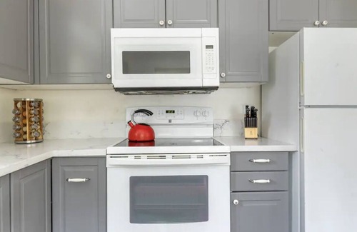The kitchen has everything you need to cook, including 4-burner electric stove/oven, BBQ propane grill, dishwasher, microwave, toaster oven, pots & pans, baking ware, cooking and eating utensils, cooking oils, herbs, spices, plates, cups, wine glasses, bottle and wine openers, blender, hand mixer and waffle maker.
