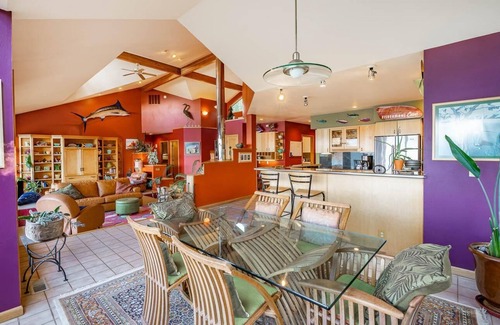 Comfortable, colorful, fun waterfront accommodation overlooking San Juan Islands and the Canadian Coast Range and bay. This spacious home as three bedrooms. There is a king size bed in the master bedroom along with a fireplace. The large bedroom also has a bathroom with a jacuzzi tub and a doors that exit onto a large deck with a hot tub. The second room has a queen sized bed along with a private bathroom. There is a deck and walk in closet. You also have a door that leads out to the grounds. The third bedroom has two twin beds that have trundle beds below. Perfect for young kids or teenagers that want to hang out all in one room. This home sleeps 8 people comfortably. Open floor plan great for Holidays or family get-togethers. Large kitchen with lots of pots and pans and serving items. Large dinning room table with an amazing view. Bird watch or read on the window seat. Watch ships and storms pass while warming your toes by the warm glow of the fire. The deck is amazing with plenty of room for BBQ gatherings, laying in the sun or sitting in the hot tub. Great base camp for skiing, hiking and excursions to British Columbia. Stroll the beach. Take the short ferry ride to Lummi Island and ride your bike to it's unique restaurants and artists studios. The Silver Reef Casino is just 5 mi away where you can enjoy fine dining and the spa. A covered bus stop is a short walk . Ride to Bellingham and the unique Fairhaven district.