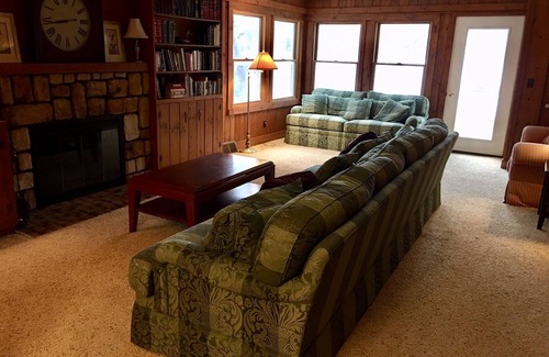 The warm pine paneling throughout the main living spaces will make you feel cozy as you cuddle up on the over-sized, down-filled couches to read, for a board game or to enjoy the wood burning fireplace. The dining room features seating for six and is a great spot for cards or to play a board game in the evenings. The cottage features three bedrooms, one with a queen bed, one with a full and one with two twin beds and a newly renovated bathroom with a walk-in shower