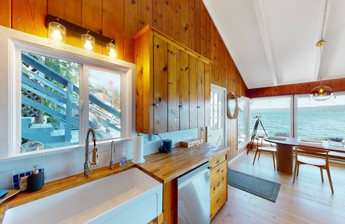 The interior is every bit as beautiful and atmospheric thanks to lofty ceilings and a rear bank of windows framing Hood Canal and the mountain backdrop. The living room exudes comfort and charm, offering warm wood paneling, a smart TV for movie nights, and a wood-burning fireplace encased in stone. There's also a lovely kitchen with stainless steel appliances, a waterfront dining space, and even a telescope to help you spot passing otters, osprey, and bald eagles. No matter your lounging choice, pure bliss is ensured every moment of your stay.