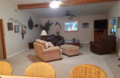 The spacious kitchen and living area affords a 180 degree view of the water from inside. The kitchen appliances have been replaced with Whirlpool's latest offerings as of May 2025. Relax and enjoy your favorite shows on the large screen TV from the source of your choice (stream your personal account, Direct TV and BluRay player provided).