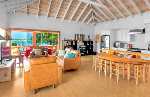 This spacious home features 4 bedrooms and 4.5 bathrooms, comfortably accommodating up to 8 adults and 2 children. A pool overlooking the ocean, a large yard, and an outdoor bar with a Hibachi grill make it perfect for family gatherings or relaxed evenings. The house is fully air-conditioned, equipped with modern amenities, and powered in part by solar energy with natural filtered rainwater. A backup generator ensures peace of mind during island power outages.