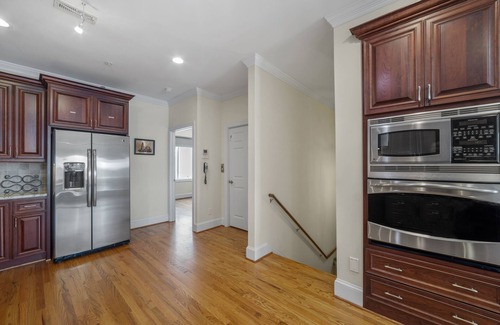 This home has 3 bedrooms, 4 full baths, elevator and 9ft ceilings that can easily accommodate up to 6 people. The floor plan is reversed with living room, kitchen, and office/guest bedroom with full Murphy bed & full bath on third floor. Second floor has master bedroom with king size bed & full bath, guest bedroom with 2 twin beds & full bath/tub and laundry room. Ground level has an additional queen Murphy bed and access to screened porch and deck.