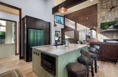 From the moment you pull into the wide circular drive and take in the dramatic facade, you’ll know you're in for something special. Step inside and let your stress melt away as natural light floods the open-concept main level, where warm wood tones meet modern textures. Sink into a reclining leather chair in the living room by the stone fireplace or gather around the live-edge dining table framed by treetop views. The fully equipped kitchen is a dream, complete with a spacious island, high-end appliances including a double oven, and seating for everyone.No pets