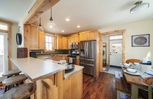 The main level features a spacious and open living area. During winter, cozy up by the fire, catch a game, or watch a movie on the 65" flat-screen TV with extended cable and Blu-ray player. There is plenty of seating for friends and family on the comfy sectional sofa. The fully stocked kitchen has stainless steel appliances, including a gas stove & oven, a French door refrigerator with a water dispenser, and an ice maker. For coffee lovers, we have a drip coffee maker and a Keurig K-Elite single-serve K-cup pod coffee brewer with iced coffee capability, and a coffee grinder. We even have an Instapot, rice-maker/slow cooker combo, and roasting & baking pans and serving ware to help complete your holiday celebrations at Chickadee.