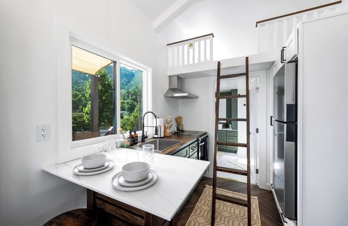 Welcome to our charming tiny house with breathtaking mountain views and starlit night skies. Nestled at the top of a hill, this cozy retreat offers a blend of peace and adventure. It features a main level and loft sleeping area, both equipped with windows facing the view. The living area is tastefully furnished with a compact kitchen. Outside, a private deck and firepit area invite you to relax and unwind. Perfect for couples or small families seeking a memorable escape.
