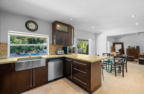 Property features include: A gourmet kitchen, imported stone floors throughout house, marble baths, impact windows, high ceilings, open floor plan which allows air and plenty of light to flow throughout the home essentially bringing the outside in. Other amenities include a beautiful pool, bath and beach towels provided. Cable TV and wireless internet access keeps you connected while the sitting areas keep you comfortable. This house can easily accommodate up to 9 people for long or short stays.