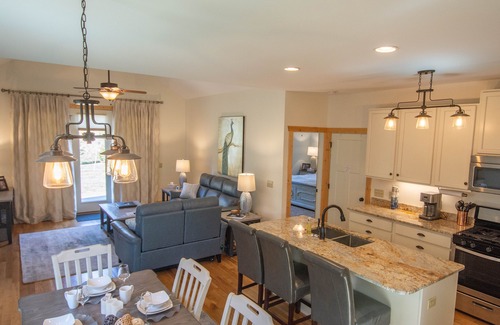 Enter through the quaint covered front porch and enjoy all the conveniences of a modern open floor plan. The kitchen, dining and living spaces are all contained in one large great room with sparkling hardwood floors and lots of natural light. The kitchen features new cabinets, a gas stove, granite countertops and stainless appliances. The adjacent dining area provides a table and six chairs, with additional seating for 3 available in cushy high-backed chairs along the spacious kitchen island. This well-equipped space is perfect for entertaining or money-saving meals at home.