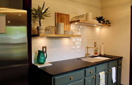 The dining room features a large dining table that will comfortably seat 6, with dimmable lighting to set the right mood! The dining room also has a bar cart stocked with wine/champagne glasses and a cocktail mixing set.