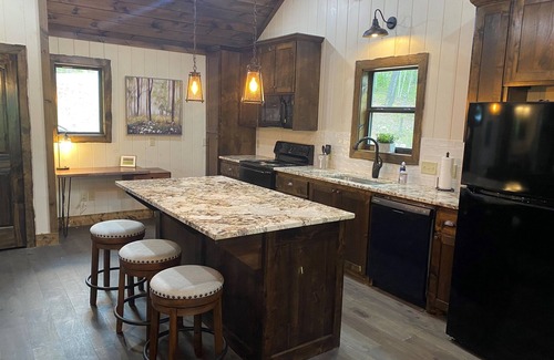 Built in 2023, this romantic couples’ retreat near the Buffalo National River and the town of Jasper, AR, offers gorgeous mountain views of the Ozarks. The cozy cabin features an open studio concept with a see-through gas fireplace, a custom rock tub with a mountain mural surround, and beautiful furnishings. The king-size custom platform bed is made from 100+-year-old barn wood. The cabin also includes a private toilet room and a gorgeous dual-fixture ceramic tile shower with sparkling glass tile accents. A stackable washer and dryer are located next to the fully stocked kitchen, and there is even a desk for any unexpected work duties!