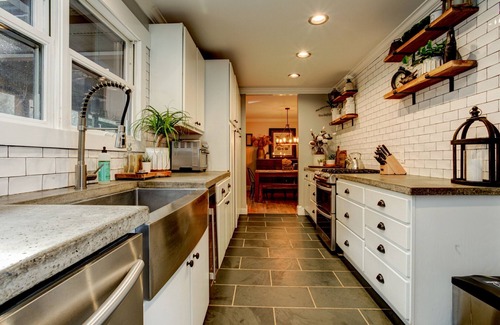 The great room, with stone fireplace, and fully equipped gourmet kitchen, is where everyone will want to gather to enjoy their time together inside the house, with plenty of space for all. But, if you need some "alone time", there is plenty of space inside and out to find your own serenity. There are 7+ outside porches, decks, screened porch and patios for ultimate outdoor relaxation. Dogs are WELCOME as well! The estate consists of 3 separate structures; main lodge house (4-bedrooms/3 baths), and 2 separate “hideaway” studio/1-bedroom cottages,, Big Ivy & The Pisgah, which have a bedroom, small coffee station, and private ensuite bathroom. They each also have Sleeping Lofts with twin beds to accommodate families and/or larger groups staying at Whiskey Rock.