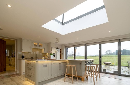 Open plan Kitchen/Dining: Dishwasher, washer/dryer, wine chiller, fridge/freezer, oven, hob. French doors open out to a patio area overlooking the meadow