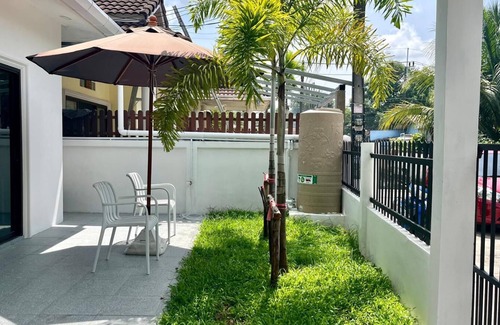 It is a single house with two bedrooms plus 1 bathroom with about 100 sq meters usable area (30 sq wah plot of land) with fresh air at garden with chairs and umbrella located infront of the house. This terrace is good for your coffee in the morning and evening. Free private Optic Fiberwifi with 500/500Mbps package, private washing machine, microwave, toster, gas stove, big refrigerator, kitchen wares, utensils.