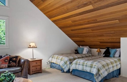 The cabin includes a full kitchen with refrigerator, freezer, dishwasher, coffee maker, microwave, indoor electric range and outdoor BBQ. Enjoy the large flat screen TV with Dish satellite, pool table, foosball table, and lots of games. The natural rock fireplace is propane gas and easy to use. The outside deck is covered, with an outdoor gas BBQ, large picnic table, and various outdoor seating, including four lovely shaker-style rocking chairs! Two bedrooms/two baths (master bedroom includes a King size bed and on suite bathroom/shower), with four additional twin beds in the huge open sleeping loft, which also has vaulted ceilings. All blankets, bed linens and towels are provided. There is plenty of room for vehicle parking on the property, right outside the door.