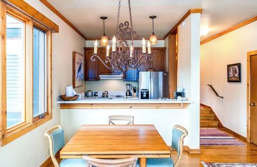 Inside, the space is classic, cozy, and effortless. You'll walk into an open-concept layout with a full kitchen that's got everything you need to cook your favorite meals—or just reheat dinner from The Ram. The dining table seats four, perfect for a long breakfast or a board game night. The living room has comfy seating, a smart TV, and a stone fireplace that brings the perfect après-ski glow in the winter. It's the kind of space that makes you want to pour a glass of wine and settle in with a good book.