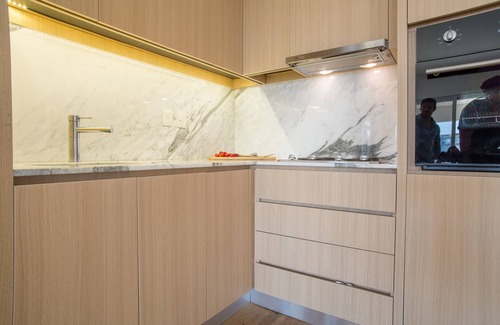 Full-equipped 2-bedroom apartment with 2 full bathrooms fully covered in Carrara Marbel and balcony overlooking the lake with BBQ.