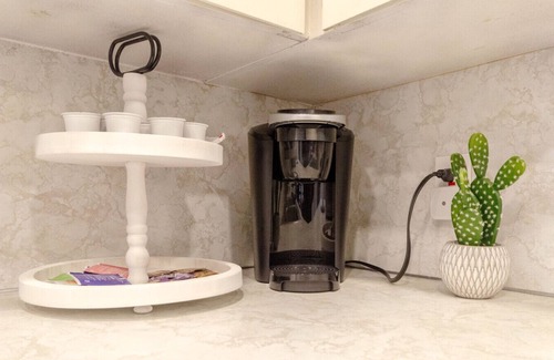 * Enjoy a tea sampler, Keurig coffee machine (with coffee, creamer, and sugar), and a bistro table for casual dining.